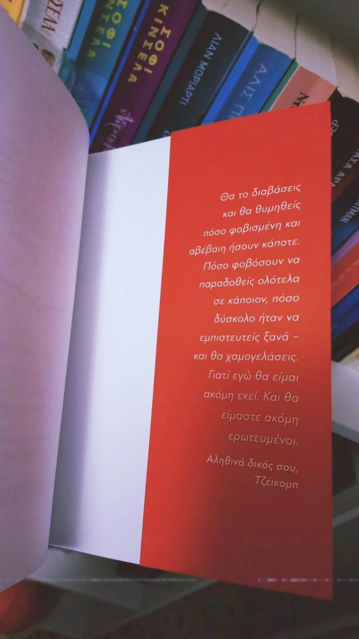 Λίγο πιο συγκεκριμένα, το βιβλίο αυτό με “διέλυσε”, διότι περιγράφει όλα όσα θέλει να ζήσει κάθε γυναίκα, αλλά συνειδητοποιεί ότι μπορεί ν’ αρκεστεί στο να τα διαβάζει μονάχα στα βιβλία. Γιατί πέρα απ’ το κοινωνικό άγχος, την κατάθλιψη, την κατάρρευση, τον φόβο και τον τρόμο που βιώνουμε στην καθημερινότητά μας, που μάς λυγίζουν, αλλά κατορθώνουμε να μείνουμε όρθιοι μ’ όποιο μέσο και κόστος, το βιβλίο περιγράφει το είδος της αγάπης, το είδος της γυναίκας, το είδος του άνδρα που πάνω απ’ όλα βάζει την ενσυναίσθηση, την ακινδυνοτητα. Γιατί, πλέον, στις μέρες μας η αγάπη είναι συμβιβασμός κι όχι αμοιβαίες υποχωρήσεις. Είναι εγωισμός κι όχι σκέψεις για το εμείς. Και με κατακλύζει στενοχώρια που δεν θα ζήσουμε ποτε έρωτες σαν κι αυτούς. Έρωτες ακίνδυνους και δυνατούς. Έρωτες που φαίνονται υπέρ το δέον λυρικοί και μη ρεαλιστικοί αλλά αδιαμφισβήτα έρωτες που έτσι θα έπρεπε να είναι…